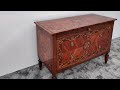 Die Seitenflächen und die Deckplatte spiegeln das zentrale Motiv wider, was der Kommode eine harmonische, rundum gestaltete Präsenz verleiht. Die Messingbeschläge und originalen Schlüssel ergänzen das historische Gesamtbild.