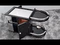 Der Wagen ruht auf Rollen und zeigt eine flache, längsrechteckige Silhouette mit zwei halbrunden Ablageböden. Diese werden von formschönen Chrombügeln eingefasst, die die Struktur betonen und zugleich praktischen Halt bieten. Der obere Bereich ist verspiegelt – eine raffinierte Oberfläche, die Licht einfängt und Tiefe erzeugt. Im Zentrum befindet sich ein Schrankfach mit Türen auf Vorder- und Rückseite. Der Innenraum mit Fachböden aus Eiche bietet diskreten Stauraum.