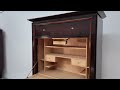 Der Innenraum überrascht mit einem klar gegliederten Interieur aus hellem Ahorn, das einen wunderbaren Kontrast zur dunklen Außenhaut bildet. Zahlreiche offene Fächer, zwei kleine Schubladen sowie eine lederbezogene Schreibklappe bieten Funktionalität auf hohem ästhetischem Niveau. Der helle Innenraum ist nicht nur durchdacht gestaltet, sondern verströmt auch jene luxuriöse Leichtigkeit, die Art-Déco-Möbel so begehrenswert macht.