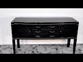 Der Korpus wurde vollständig in einem hochglänzenden schwarzen Klavierlack ausgeführt, der das Licht auf elegante Weise reflektiert und der Konsole eine luxuriöse Präsenz verleiht. Die klare, horizontale Linienführung wird durch massive, verchromte Zierleisten unterstützt – kein aufgeklebtes Dekor, sondern präzise in das Holz eingelassen, verschraubt und fest in Nuten geführt. Die Verarbeitung ist makellos und zeugt von höchster Handwerkskunst.