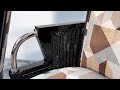 Sechs Art Deco Stühle in Schwarzlack mit geometrischem Polster